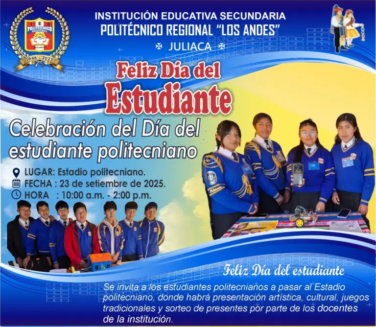 Al iniciarse las actividades de este nuevo año escolar, les damos la más cordial bienvenida a todos los integrantes de la Familia Politecniana, que tuvimos la agradable experiencia de haber vivenciado el año jubilar(75 años), saludamos en forma muy especial a todos los estudiantes y familias que se incorporan a nuestra institución educativa, invitándolos a integrarse y participar del quehacer educativo de sus hijos e hijas.